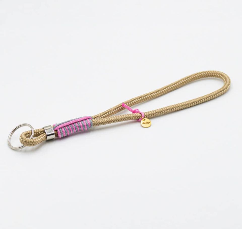Der Schlüsselanhänger/Schlüsselband ist in Beige erhältlich und verfügt über einen silbernen Ring.